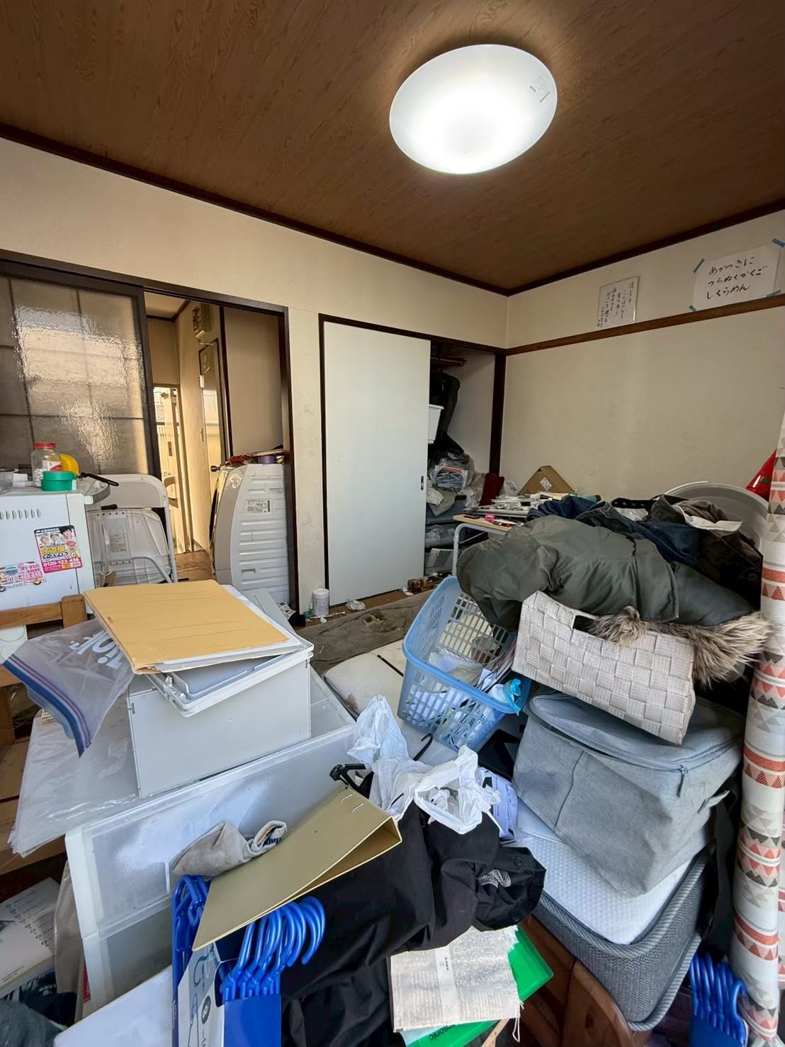 住宅密集地のマンション3階部分の整理 。道が狭く大型車が入れないため、軽トラック2台でピストン搬出。退去期限が迫っていたため、即日対応で5時間以内に完了させ、管理会社への引き渡しに間に合わせました。