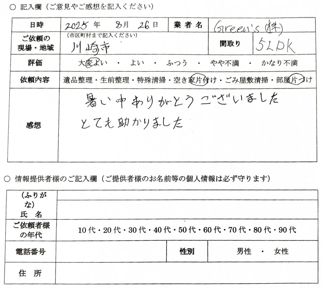 スタッフ様方の印象も接客もおても丁寧で、遺品もきちんと片してくださいました。 後片付けで、お部屋もきれいにして下さりとても助かりました。 今日は本当にありがとうございました。
