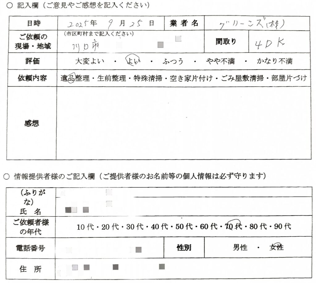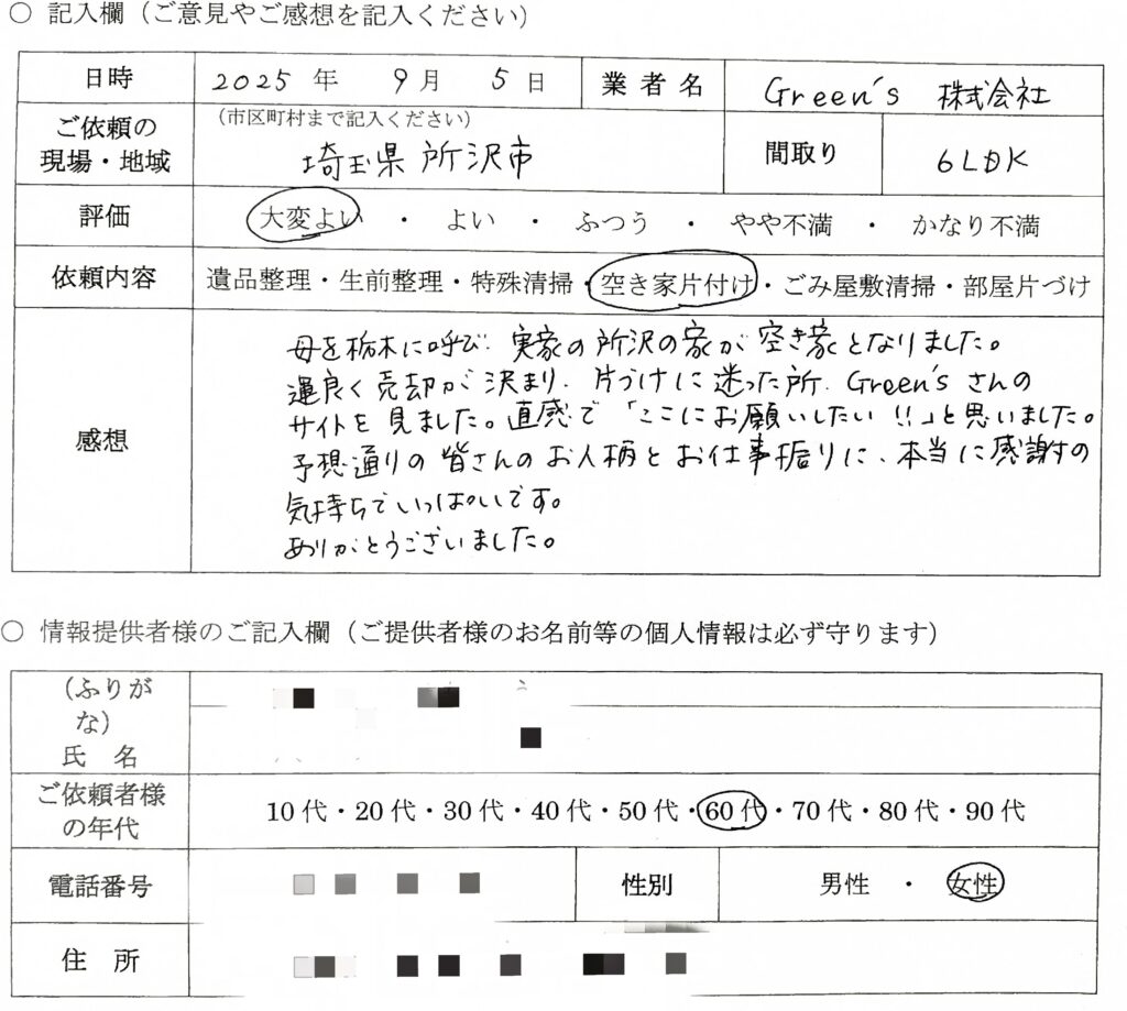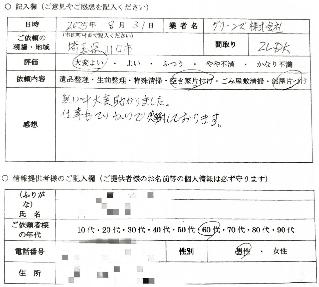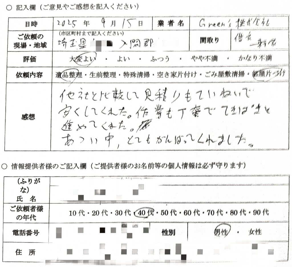 母を栃木に呼び、実家の所沢の家が空き家となりました。運良く売却が決まり、片付けに迷った所、Green’sさんのサイトを見ました。直感で「ここにお願いしたい!!」と思いました。予想通りの皆さんのお人柄とお仕事ぶ […]