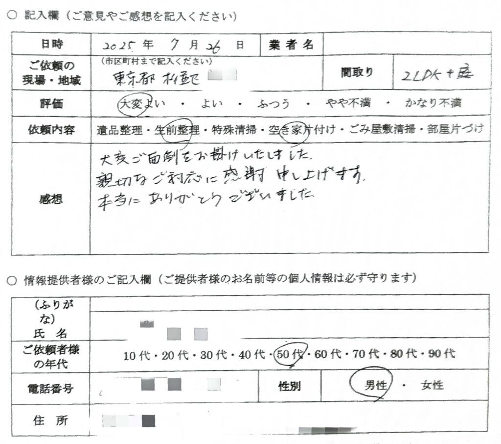 ひどく散らかった家をとてもきれいに片付けて いただき、プロの仕事を見せていただきました。 ありがとうございました。