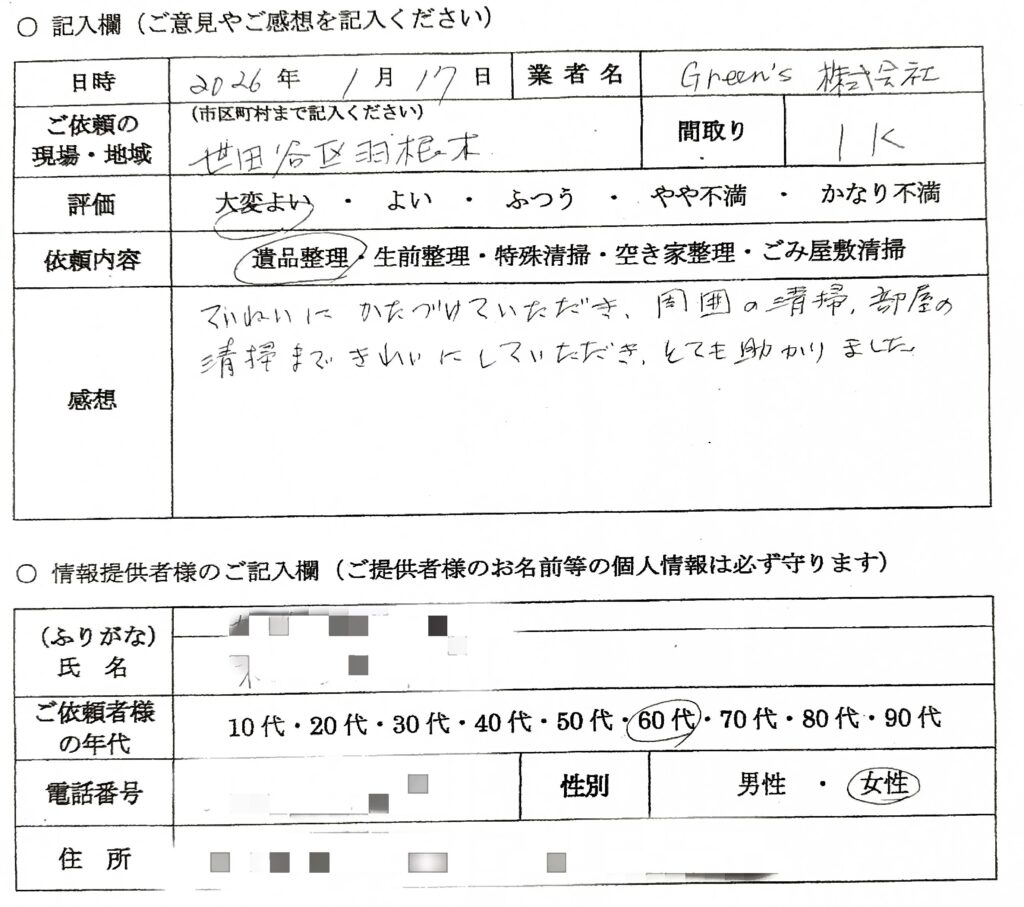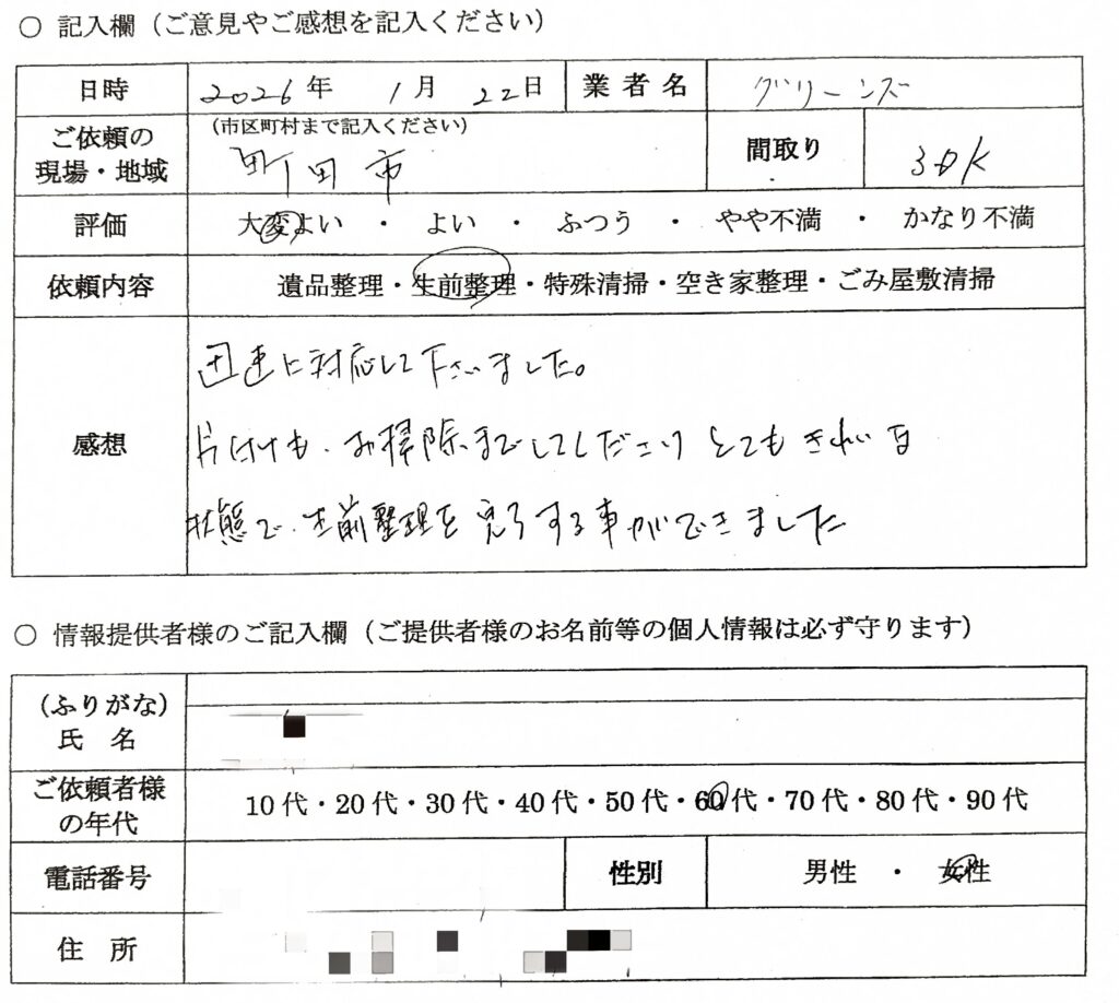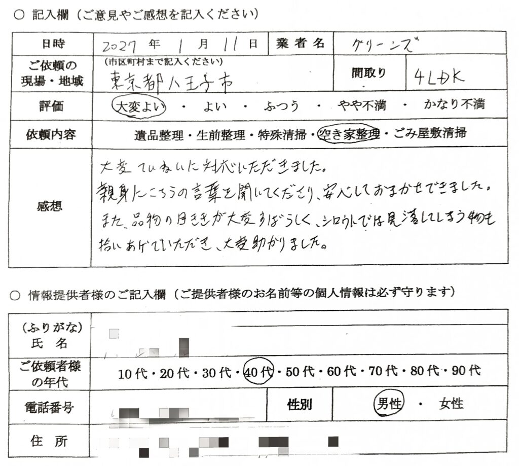 迅速に対応してくださいました。片付けも、お掃除までしてくださりとても綺麗な状態で生前整理を完了することができました。