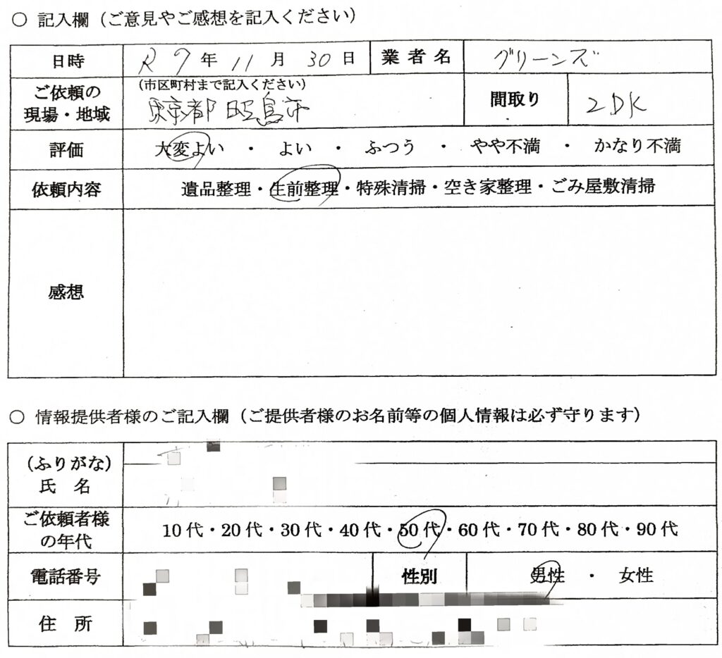 ていねいに整理していただき助かりました。 時間も最短でやっていただきました。