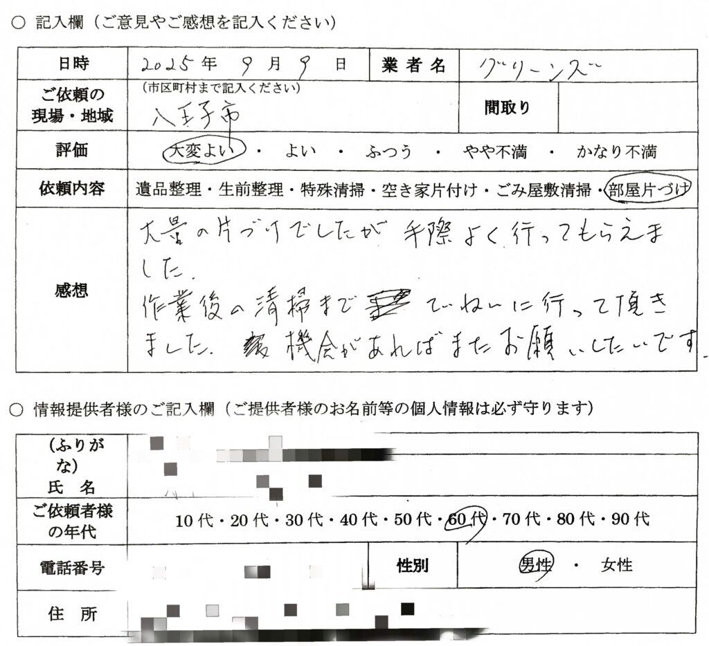 大量の片付けでしたが、手際良く行ってもらえました。作業後の清掃まで丁寧に行っていただきました。機会があればまたお願いしたいです。