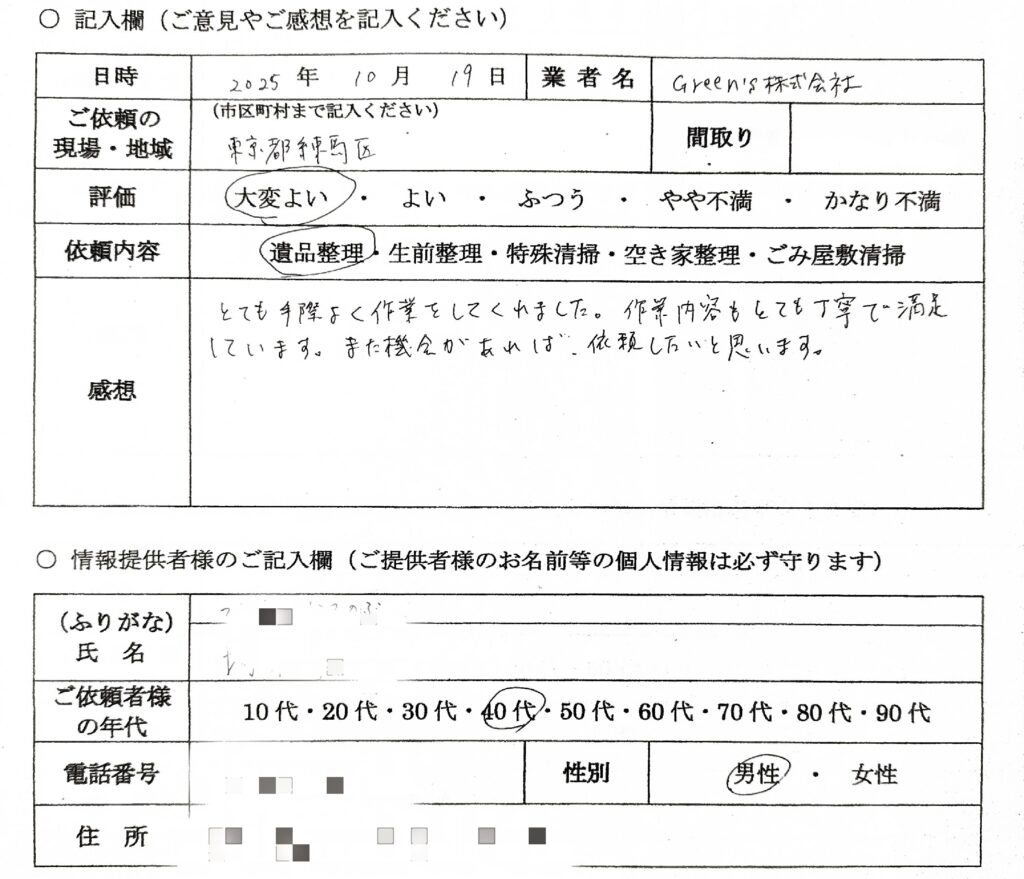 的確に手早く整理していただき、とても一人では手に負えなかった量の片付をしていただけた。