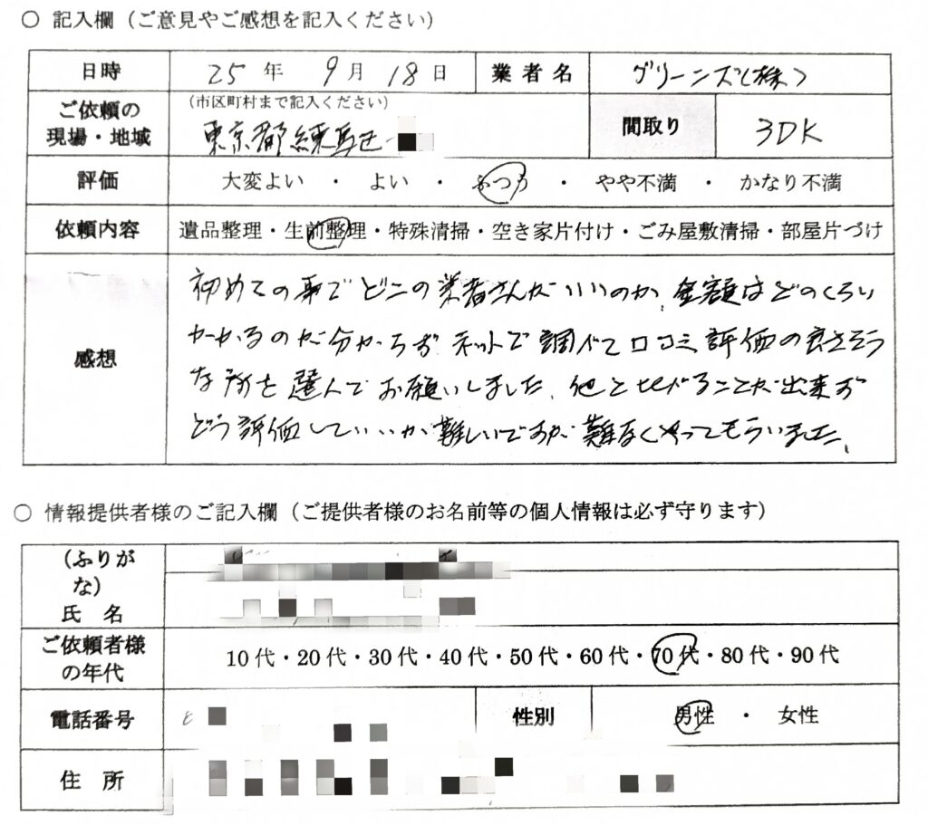 父が急死して実家に帰らなくてはいけなくなり、遺品整理をお願いしました。3部屋全て凄く綺麗になって感動しています。すごくスタッフの方が丁寧で信頼できると感じることができました。仕分けもしていただき助かりました。クローゼット […]