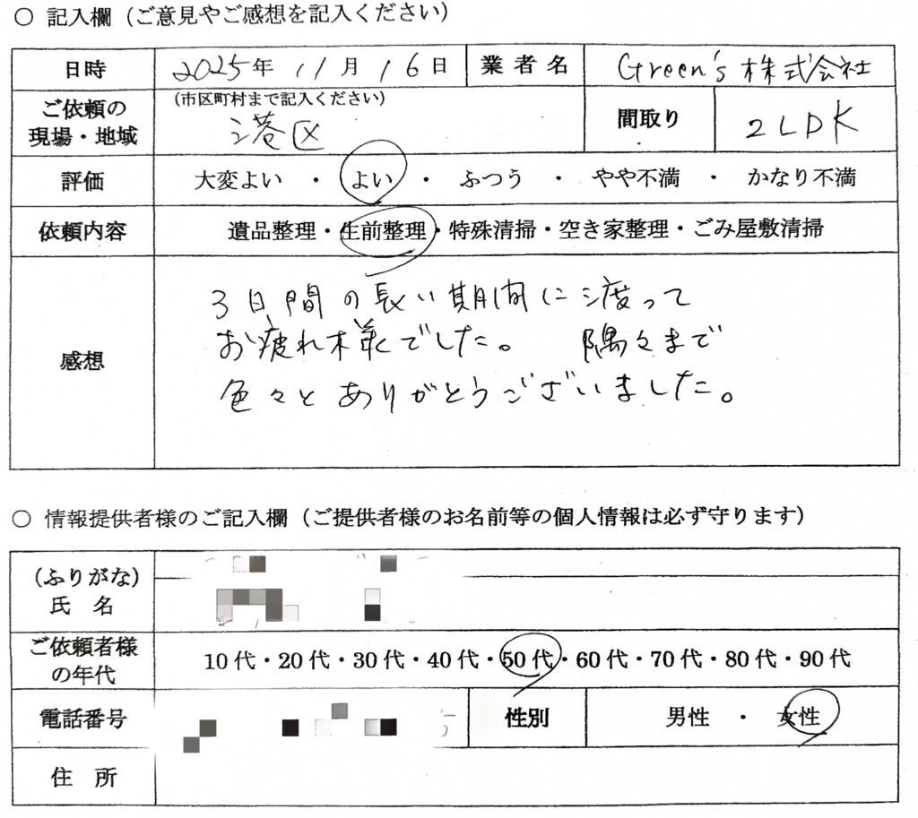 2日間にわたって行っていただきました。残したいものをきっちり仕分けしていただき助かりました。箱ごとに種類大まかに分けていただき残したいもの判別しやすくなりました。