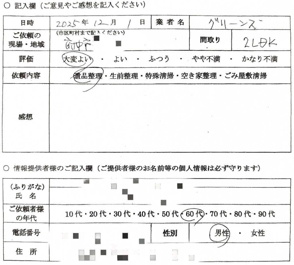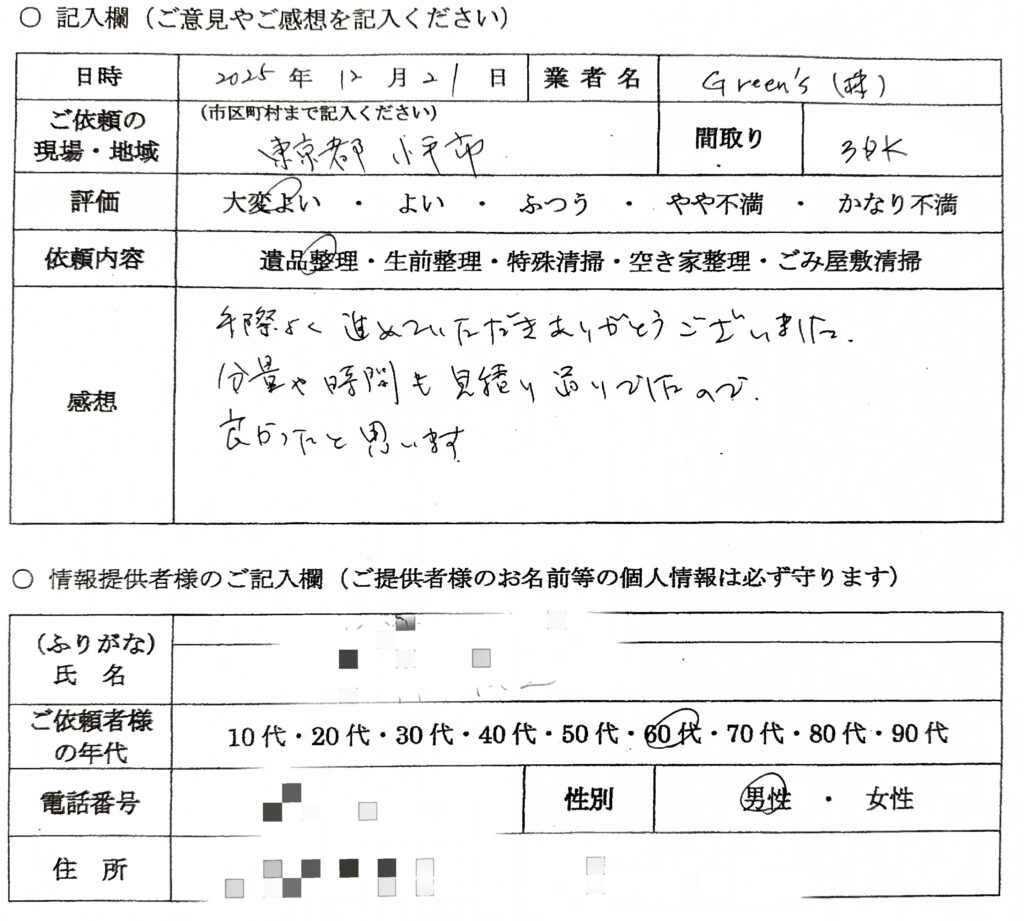 大変感じが良く、遺品整理する私も心穏やかにいられました。作業もとても早く、あっという間に終わってしまいました。また何かあった時は必ずここにお願いしたいと思いました。ありがとうございました。