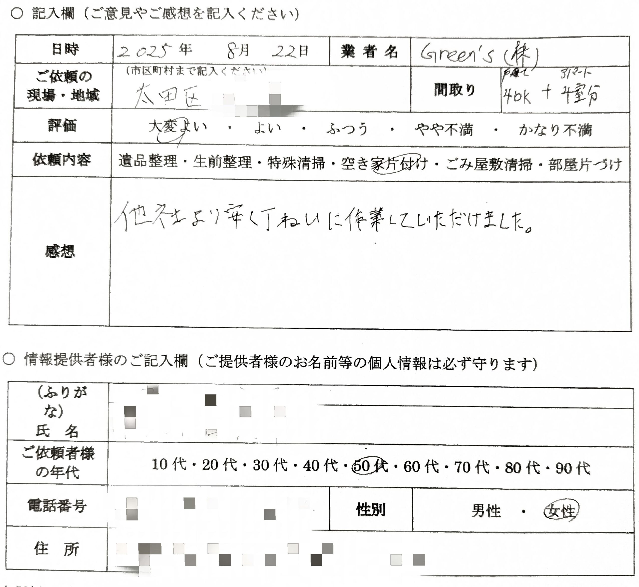 他社より安く丁寧に作業していただけました。