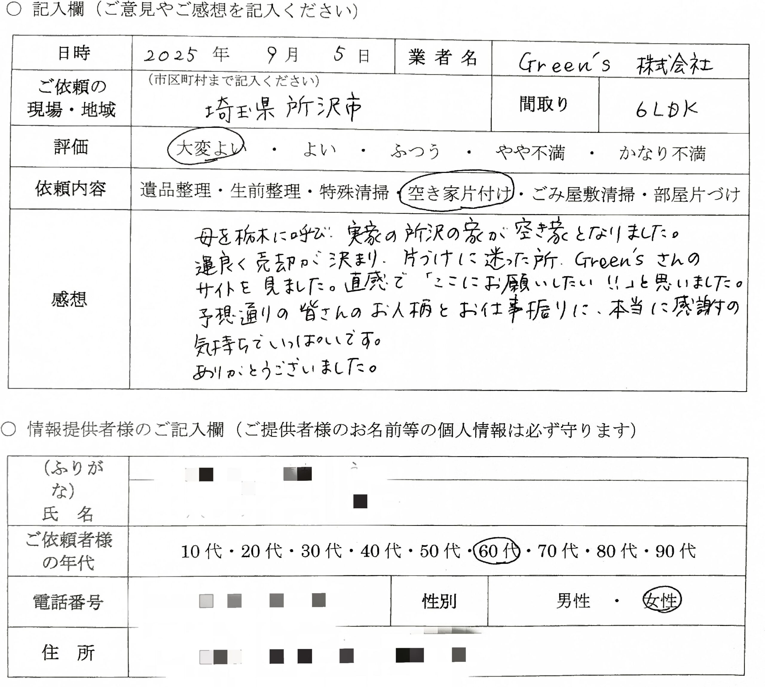 母を栃木に呼び、実家の所沢の家が空き家となりました。運良く売却が決まり、片付けに迷った所、Green’sさんのサイトを見ました。直感で「ここにお願いしたい!!」と思いました。予想通りの皆さんのお人柄とお仕事ぶりに、本当に感謝の気持ちでいっぱいです。ありがとうございました。
