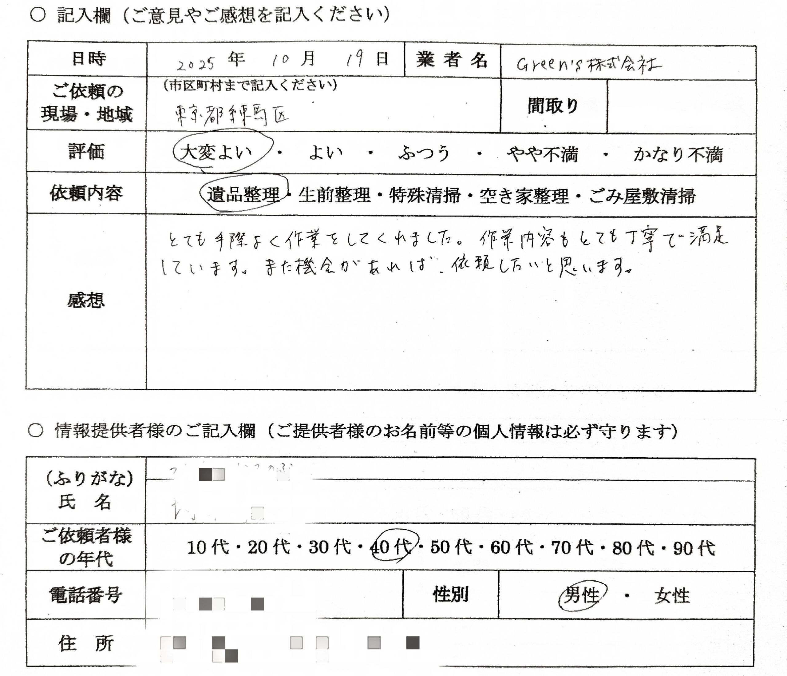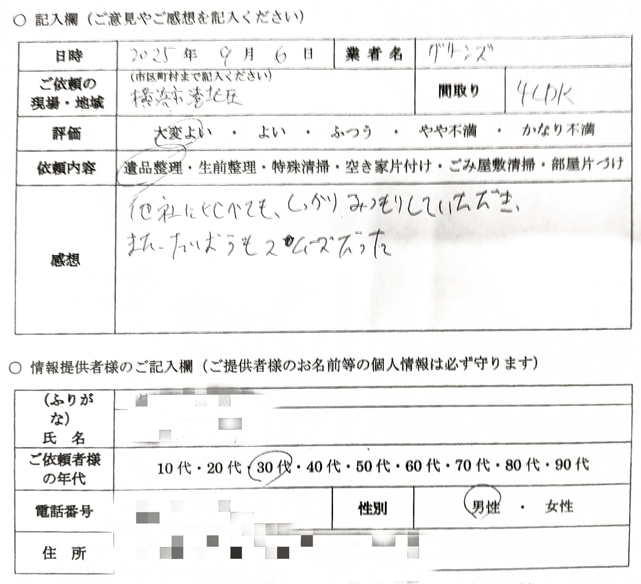 他社に比べても、しっかり見積もりしていただき、また、対応もスムーズだった。