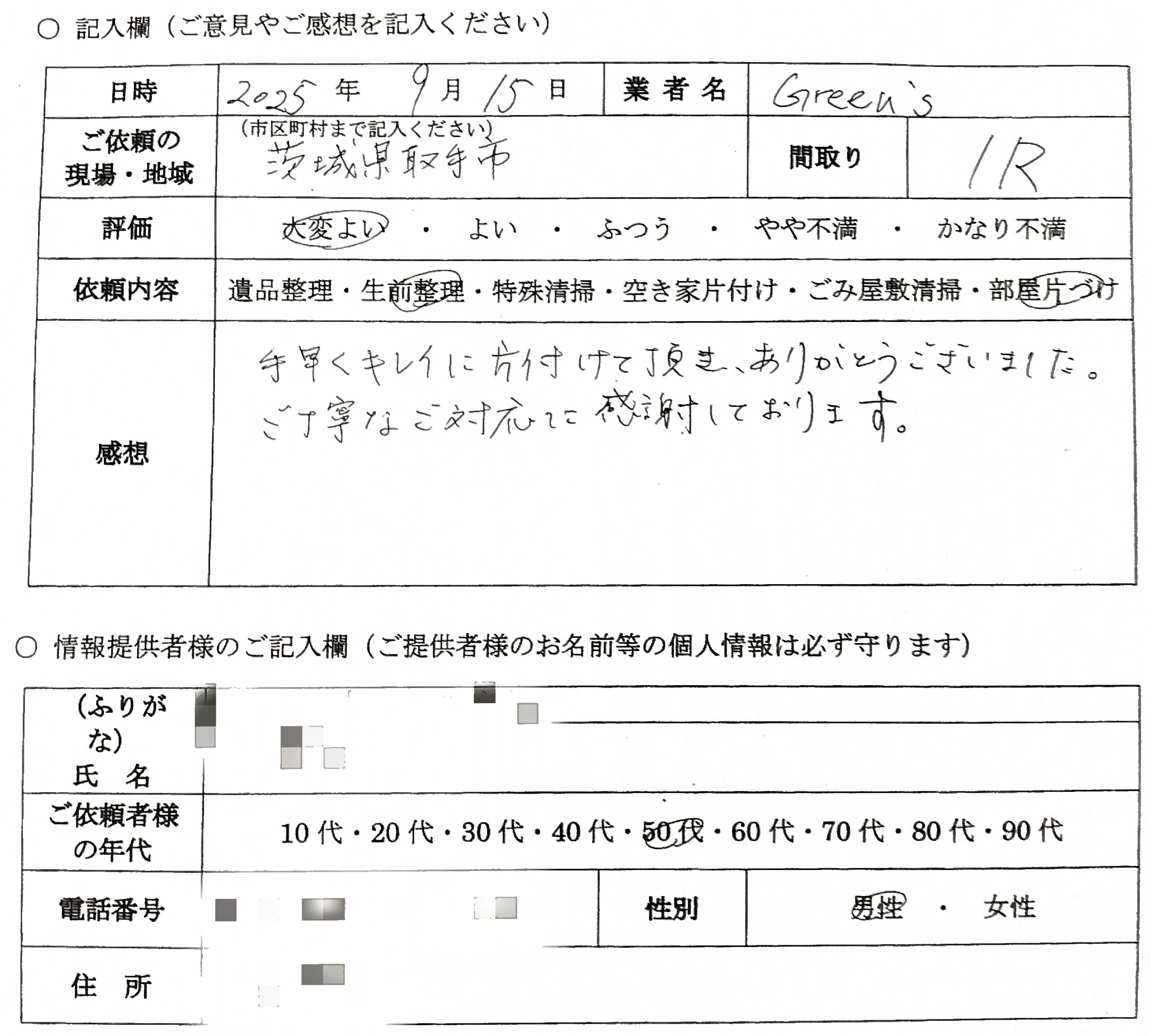 手早くキレイに片付けていただき、ありがとうございました。ご丁寧なご対応に感謝しております。