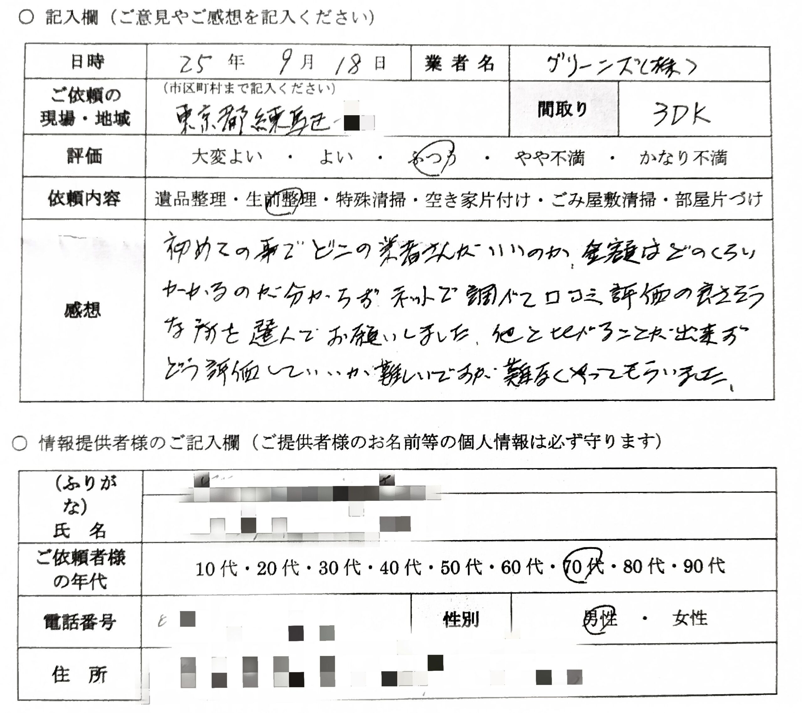 初めての事でどこの業者さんがいいのか、金額はどのくらいかかるのか分からず、ネットで調べて口コミ評価の良さそうなところを選んでお願いしました。他と比べることができず、どう評価していいか難しいですが、難なくやってもらいました。