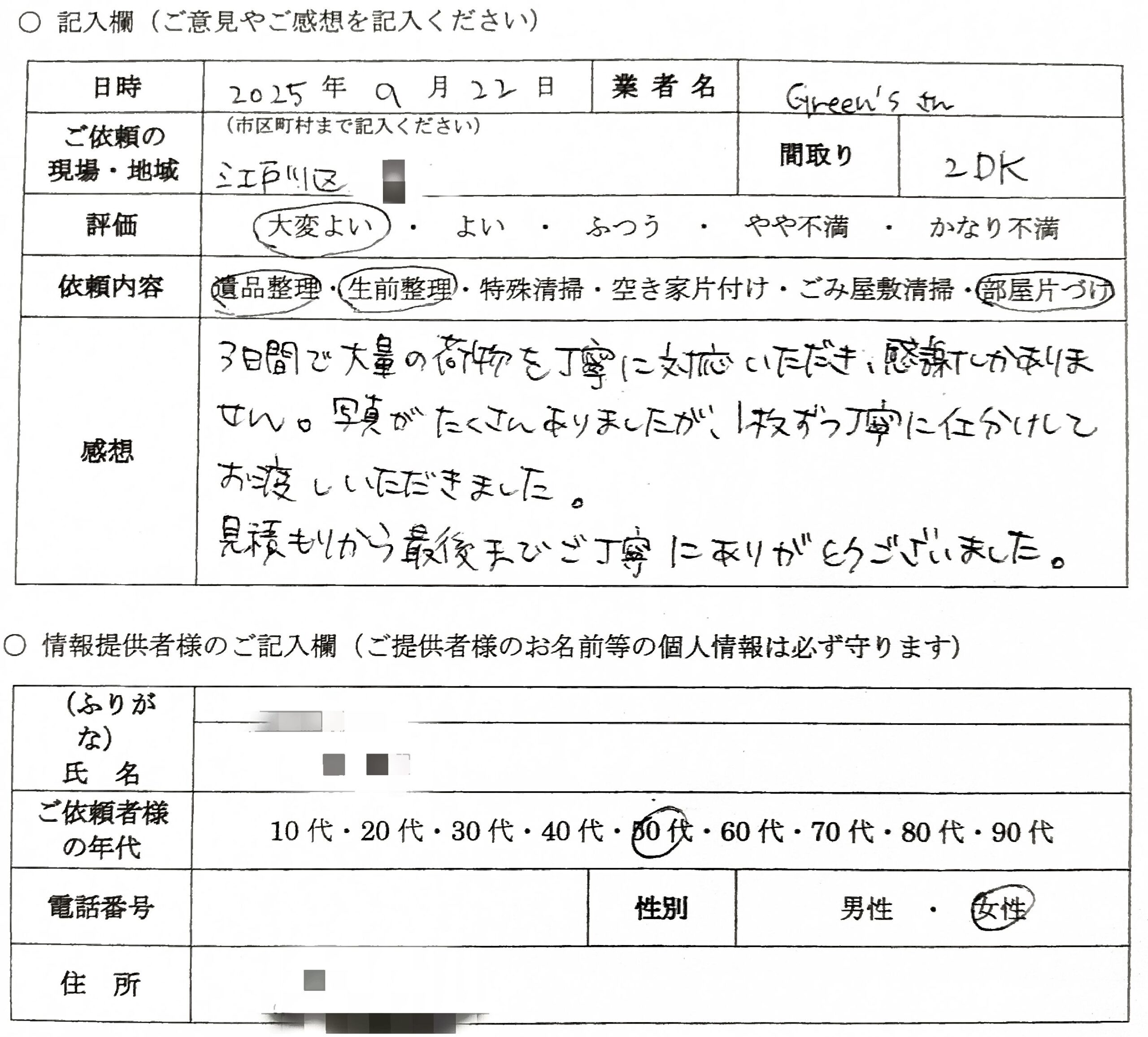 3日間で大量の荷物を丁寧に対応いただき、感謝しかありません。写真がたくさんありましたが、1枚ずつ丁寧に仕分けしてお渡しいただきました。見積もりから最後まで丁寧にありがとうございました。