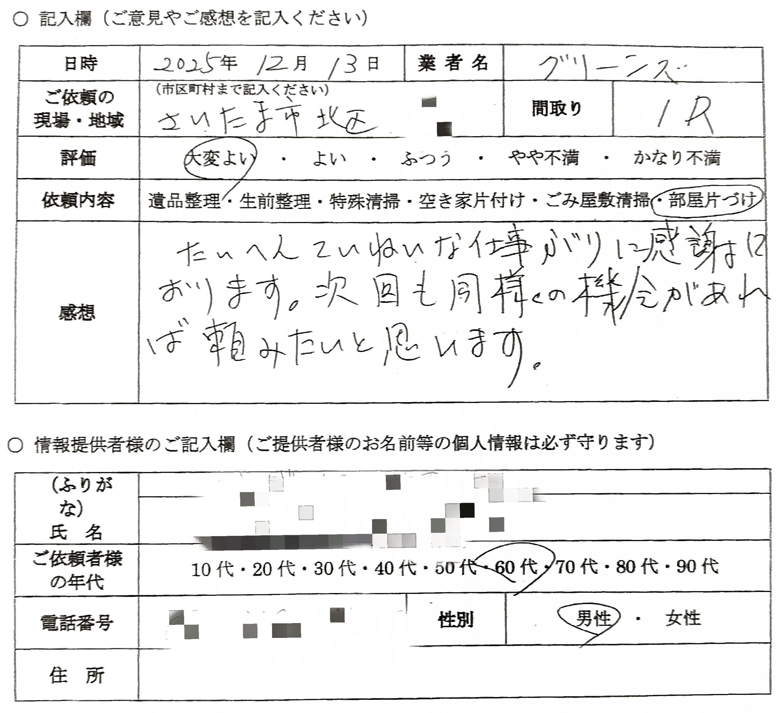 丁寧に片付けていただき、周囲の清掃、部屋の清掃まで
