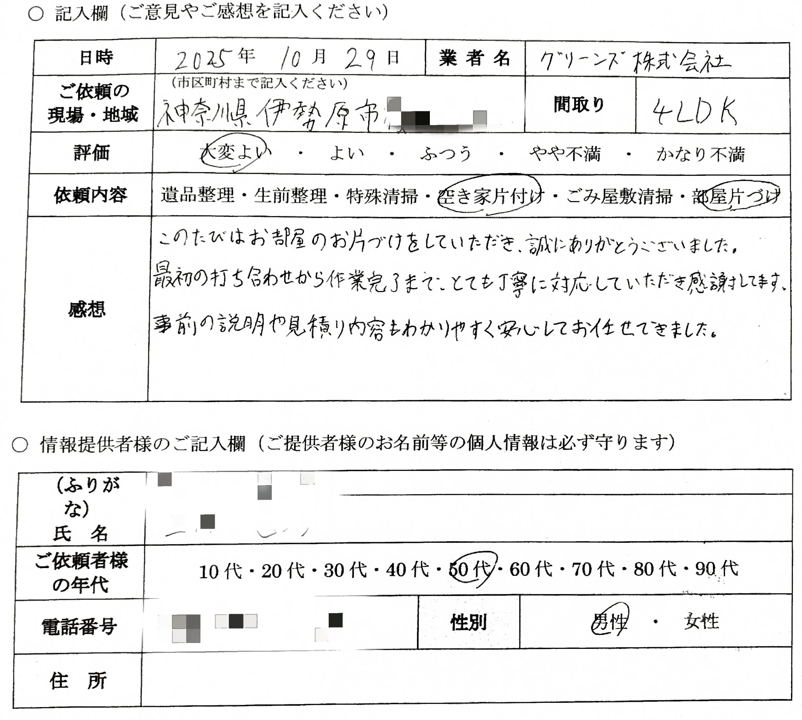 このたびはお部屋のお片付けをしていただき、誠にありがとうございました。最初の打ち合わせから作業完了まで、とても丁寧に対応していただき感謝してます。事前の説明や見積もり内容もわかりやすく安心してお任せできました。